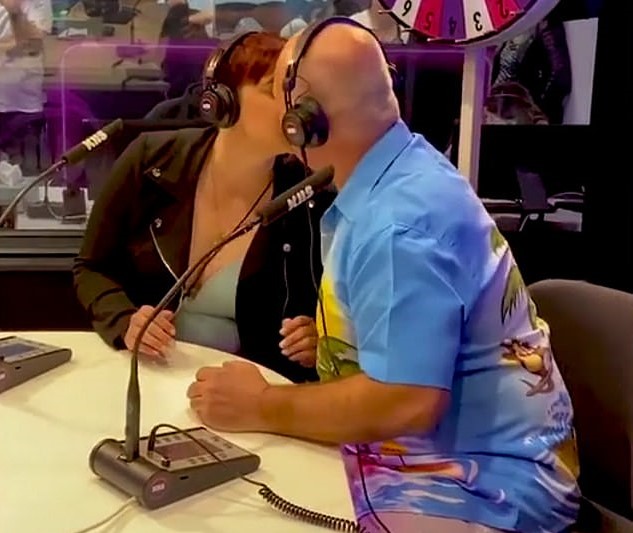 This is a shocking moment a 26-year-old woman passionately kissed her 49-year-old father live on breakfast radio, leaving hosts utterly shocked.
