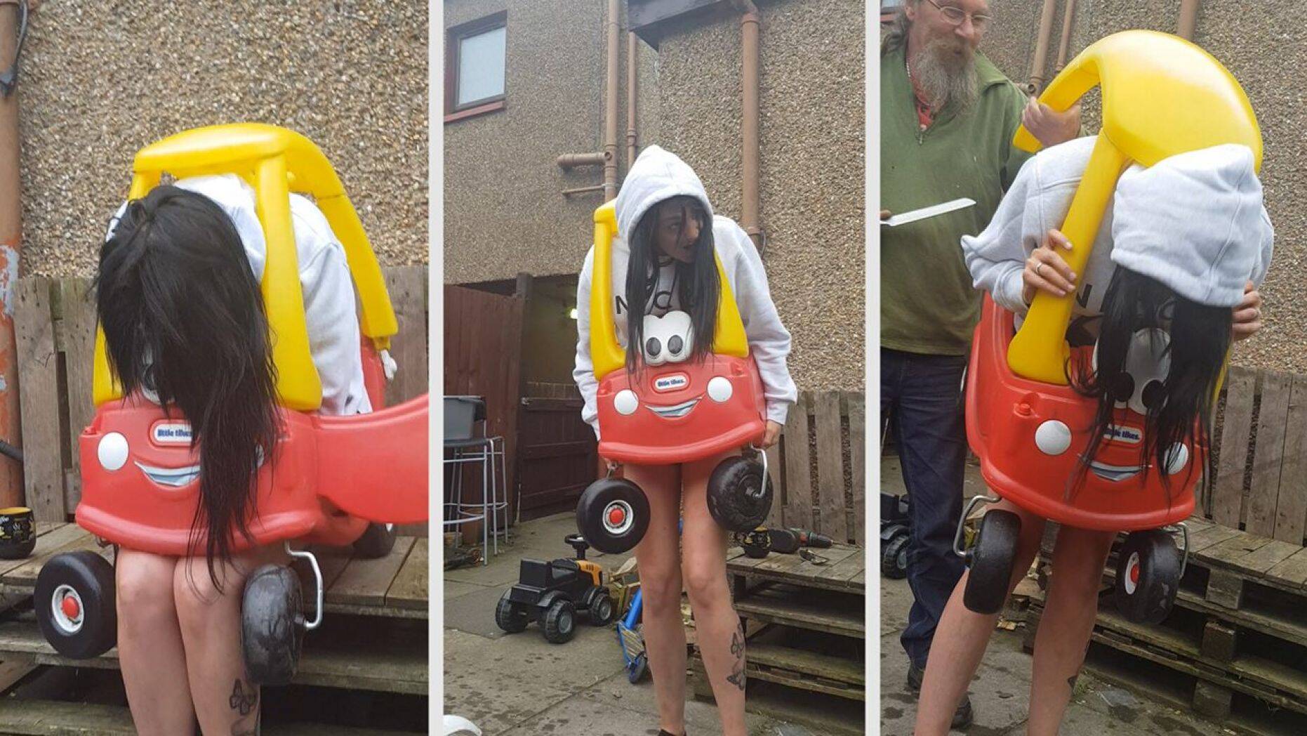 34-year-old Zoe Archibald, from Scotland, decided to driver her cousin’s red and yellow Little Tikes car but ended up getting stuck in the car.