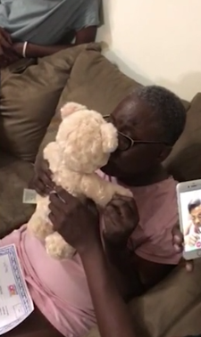 He recorded the entire scene on video. He gave the teddy to his mother who was a little surprised.