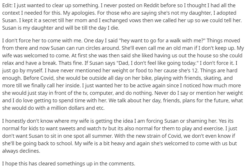 As the father added, his wife accused him of fat-shaming their daughter for helping her maintain her figure. To make matters worse, the mother told their daughter she didn’t have to exercise and encouraged her to watch TV instead.