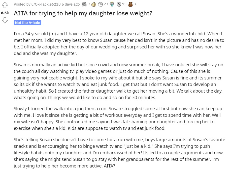 After asking Reddit for advice, the man quickly received loads of support from all sides, whereas the majority of people suggested the mother was in the wrong for feeding their daughter junk food and neglecting the need for physical recreation.
