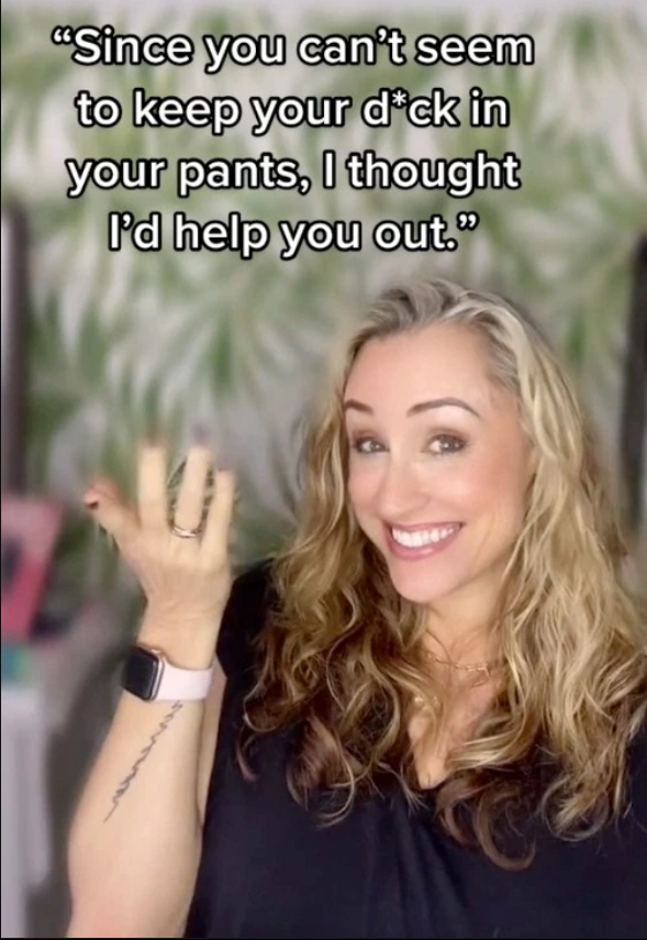 “Since you can’t seem to keep your d*** in your pants, I thought I’d help you out,” she wrote in the video.