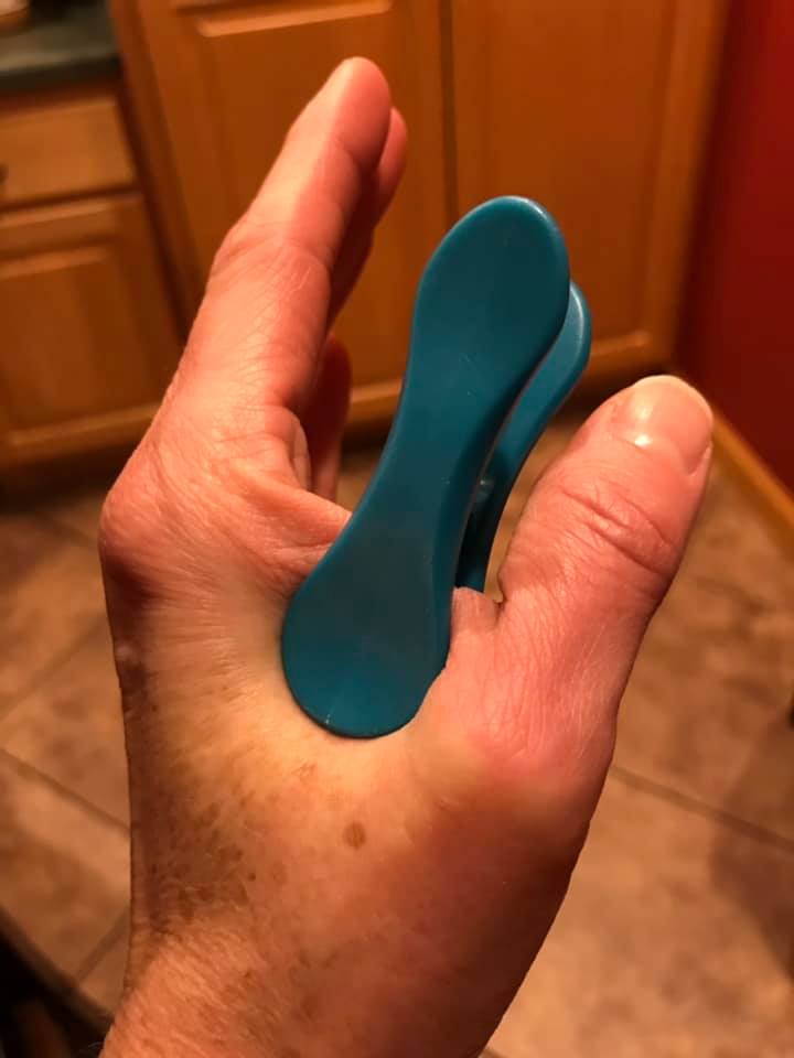 Elizabeth took inspiration from that clip and found a food clip in her kitchen, closing it over the point between her thumb and forefinger.