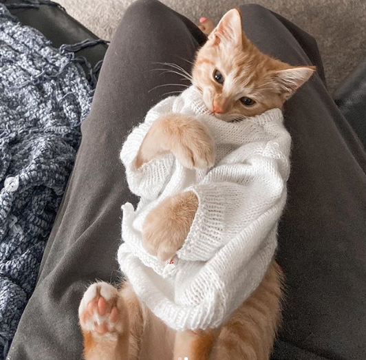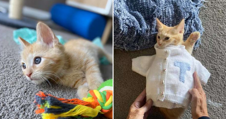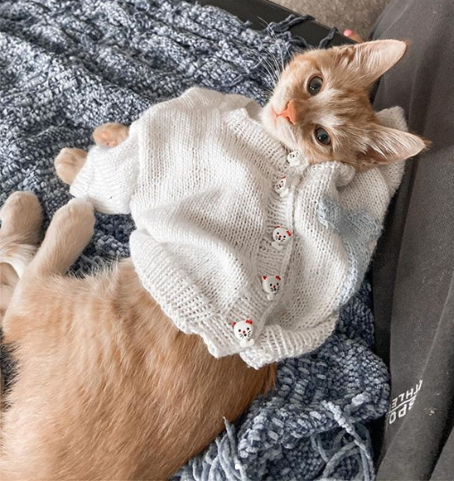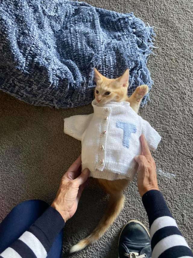 Getting tired of waiting, Dyson’s mother decided that if she could not make things for her grandchildren yet, she would just knit something for the kitten instead.