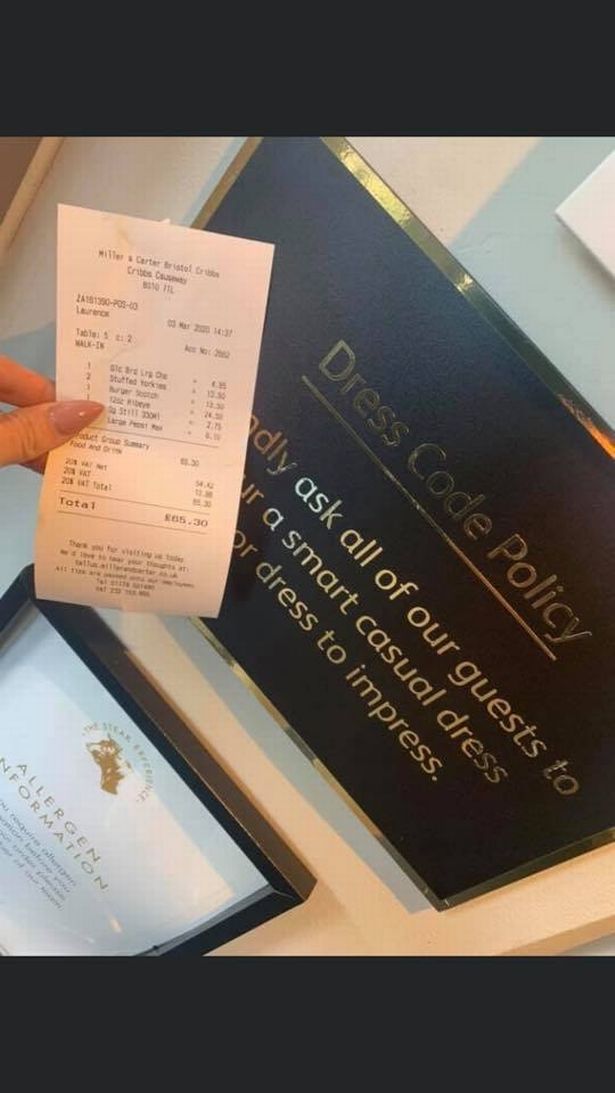 Miller & Carter spokesperson responded to the Facebook post saying: “We do have a smart-casual dress code in place at our steakhouses and what adheres to the dress code is down to the discretion of the restaurant’s manager.