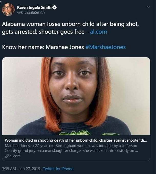 “Today, Marshae Jones is being charged with manslaughter for being pregnant and getting shot while engaging in an altercation with a person who had a gun. Tomorrow, it will be another black woman, maybe for having a drink while pregnant. And after that, another, for not obtaining adequate prenatal care.