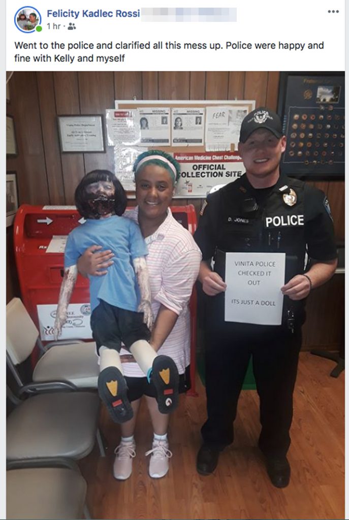 During her visit to Vinita Police station on 28 March, Felicity took a picture with Kelly and a policeman who was holding a sign stating, ‘Vinita police checked it out. It’s just a doll.’
