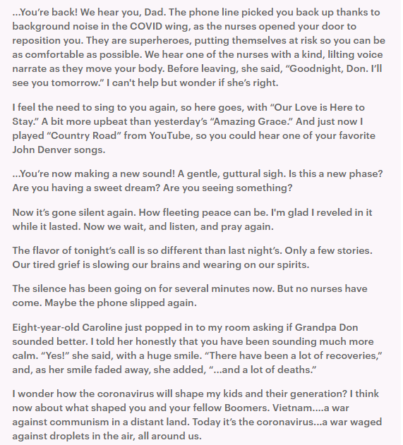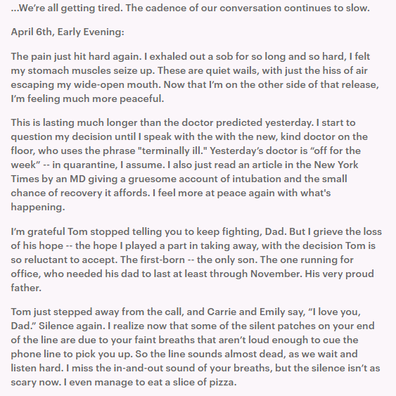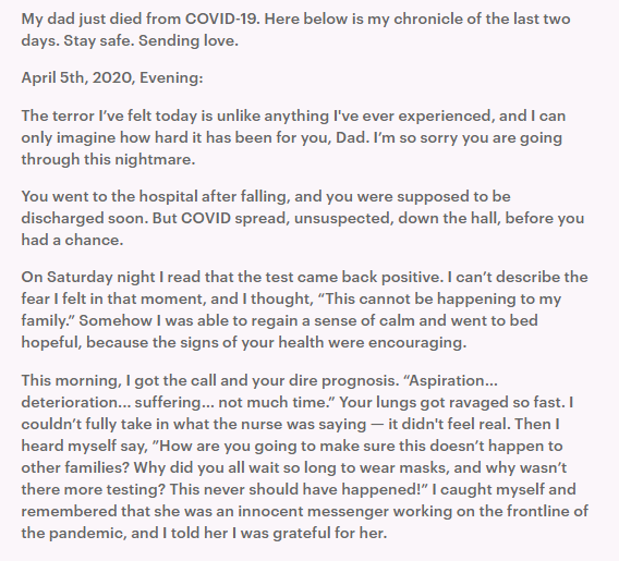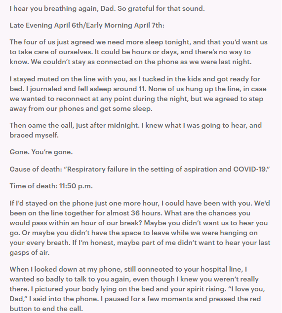 Writing on Facebook, Abby shared: “My dad just died from COVID-19. Here below is my chronicle of the last two days. Stay safe. Sending love.”
