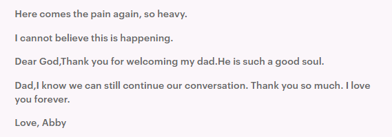 “The weight of this reality hit hard, the dam broke, and I sobbed, realizing I couldn’t go to be by your side,” Abby wrote.
