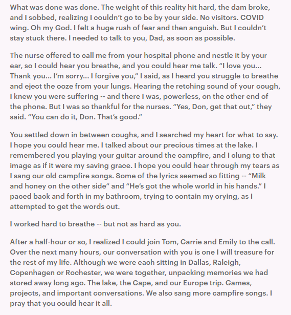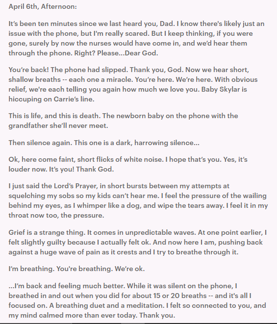 She documented the agony of those two days leading up to her father’s demise, sharing how she and her family stayed on the phone with him, praying while listening for his breathing.