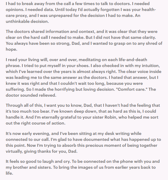 When her father passed away, she wrote: “When I looked down at my phone, still connected to your hospital line, I wanted so badly to talk to you again, even though I knew you weren’t really there.