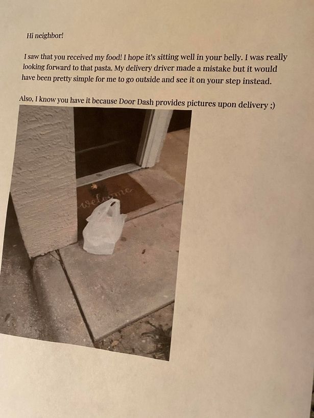“Hi neighbor. I saw that you received my food! I hope it’s sitting well in your belly,” the woman wrote in the letter she submitted to her neighbor.
