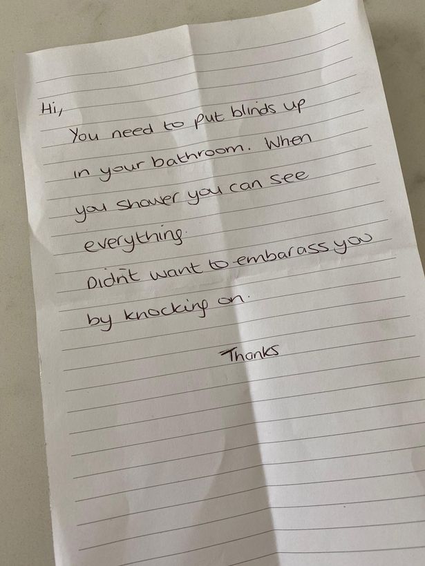 A 26-year-old woman was left extremely embarrassed after a neighbor left her a note telling her that people could see ‘everything’ through her ‘frosted’ bathroom window.