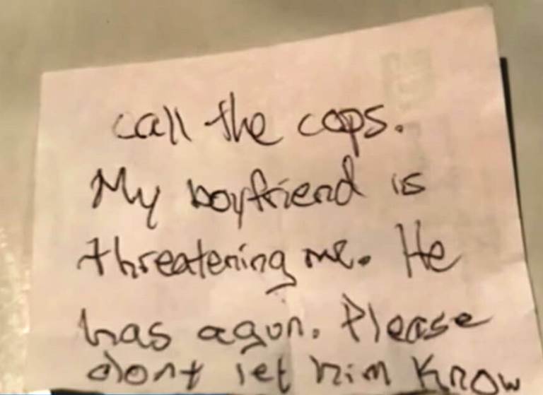 “Call the cops. My boyfriend is threatening me. He has a gun. Please don’t let him know.”
