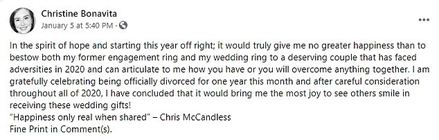 “It would truly give me no greater happiness than to bestow both my former engagement ring and my wedding ring to a deserving couple that has faced adversities in 2020 and can articulate to me how you have or you will overcome anything together.”