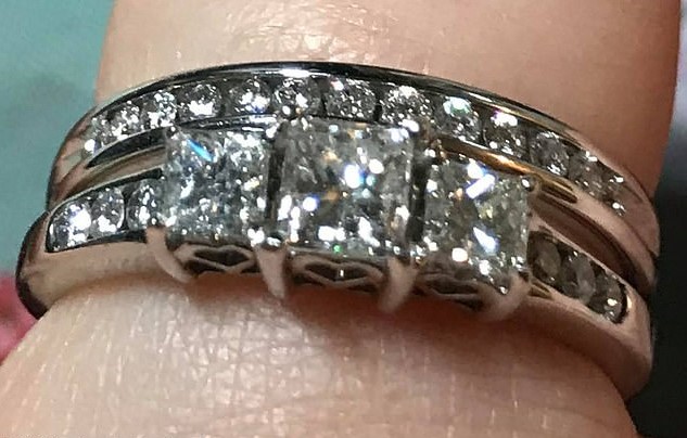 The sparkling engagement ring has three diamonds and was purchased for $2,799.99 in 2010. The wedding band has a smaller diamond and was bought for $759.