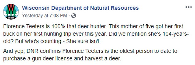 Teeters made history by becoming the oldest person to ‘purchase a gun deer license and harvest a deer,’ according to the state records of the Wisconsin Department of Natural Resources.