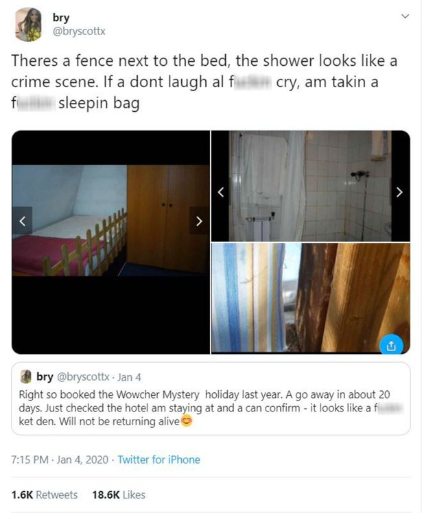 A Glasgow woman shared her horror after seeing the hotel she was staying in as part of her Wowcher mystery holiday looked like a “ket den”.