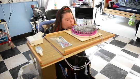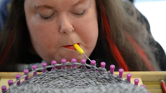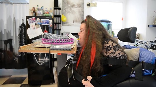 A quadriplegic woman, who has been paralyzed from the neck down after a car hit her, can knit using just her mouth.
