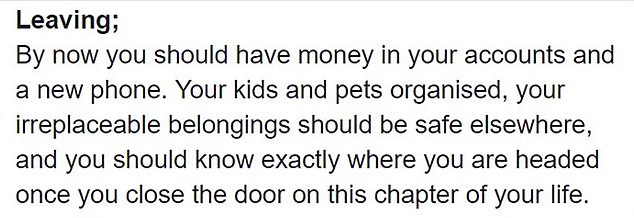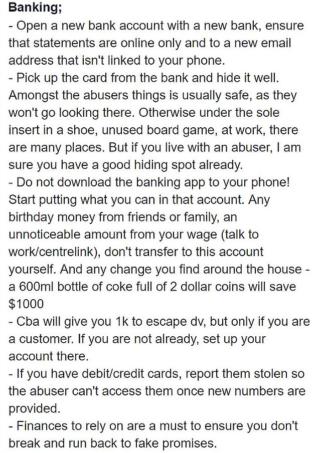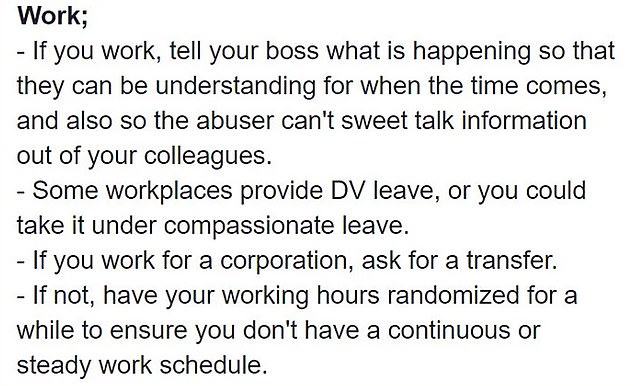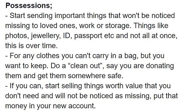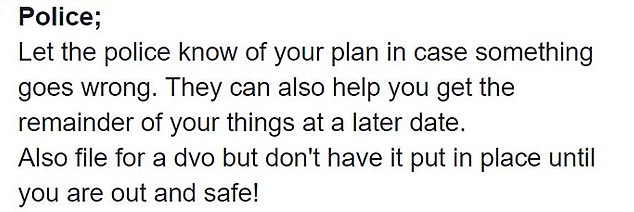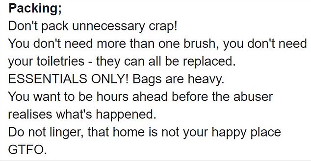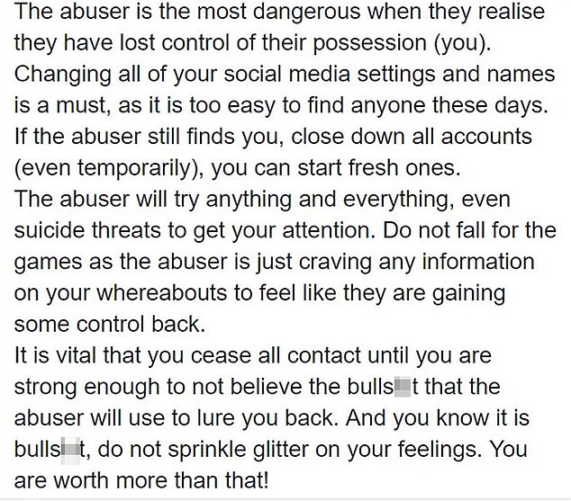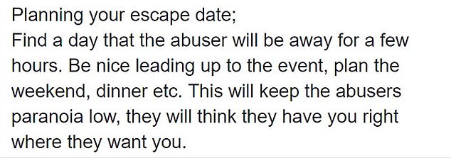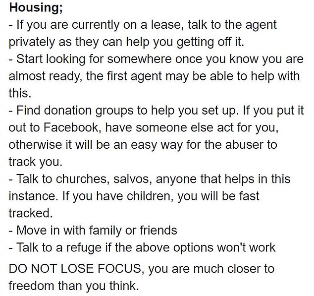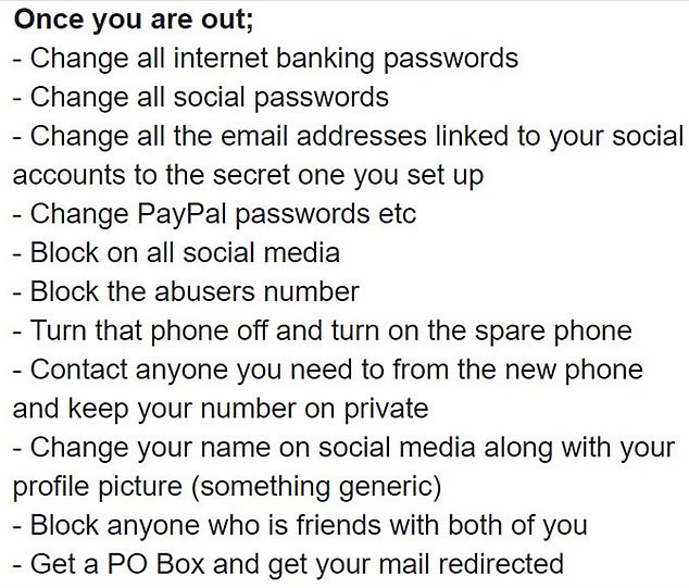 Facebook user Maddie shared a guide for anyone who needs to know how to leave their abusive partner. The plan was broken down into sections such as possessions, family, housing, fiancés and work. It also described how to go off the grid as around 60 percent of victims reported being stalked by a former or current intimate partner.
