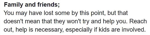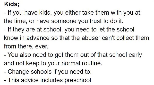 One person wrote: “Please also remember. An abuser can do most of this as a form of abuse. My mother (abuser) went to the cops about my father saying he was not allowed near me, my brother, or the school. He was arrested for trying to pick us up on his scheduled day. Be aware of what your abuser is doing at all costs. It may hurt you more than anything else. Get away asap, it’s safer and better.”