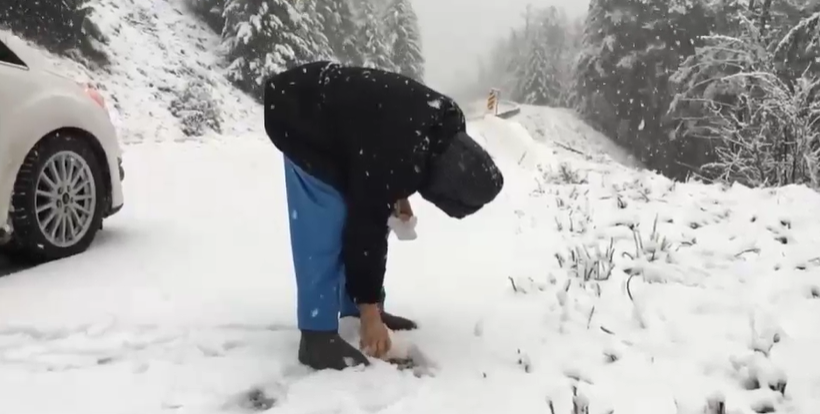 When Armand stopped his car somewhere in the middle of the highway, his mother got off the car and started playing with the snow.