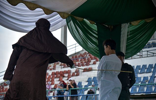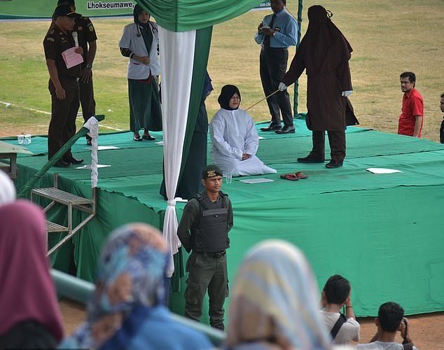 One official from the local prosecutor’s office, Fakhrillah, said the punishment was held inside a stadium to prevent children from watching.