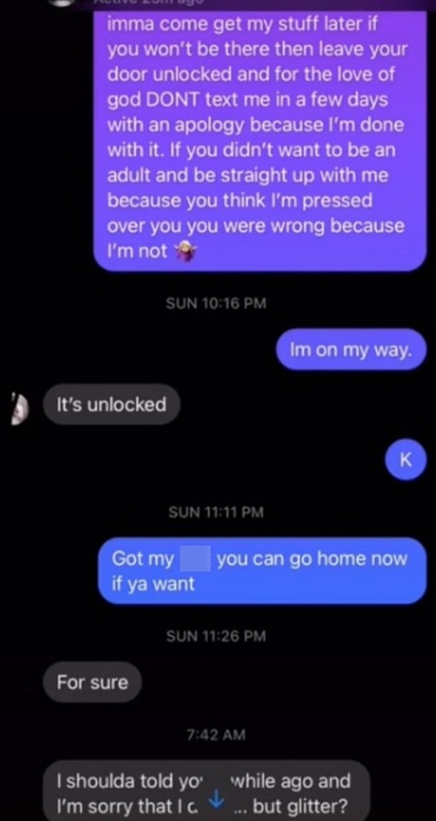 Feeling betrayed, however, she decided to punish her former partner by covering his entire house in glitters before moving on with her life.