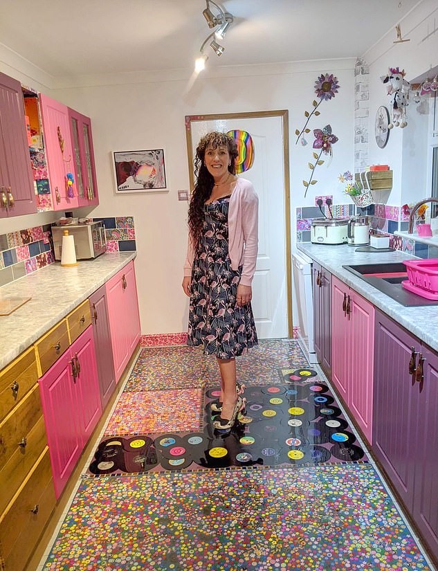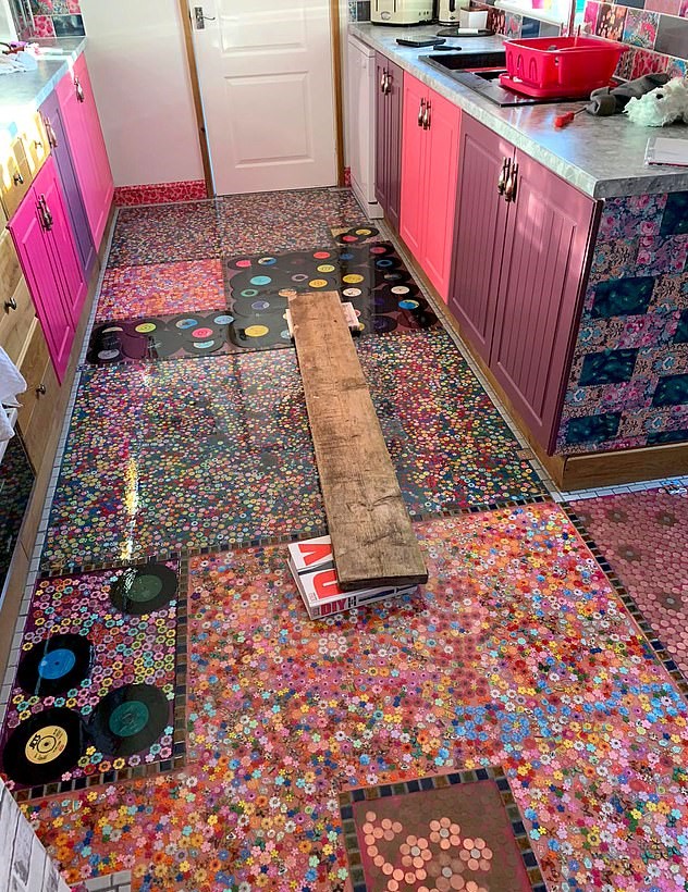 And so, the mum-of-three used Jason’s favorite vinyl records, including those from popular bands such as Paper Lace and Dire Straits, to make a shiny, one-of-a-kind kitchen floor.