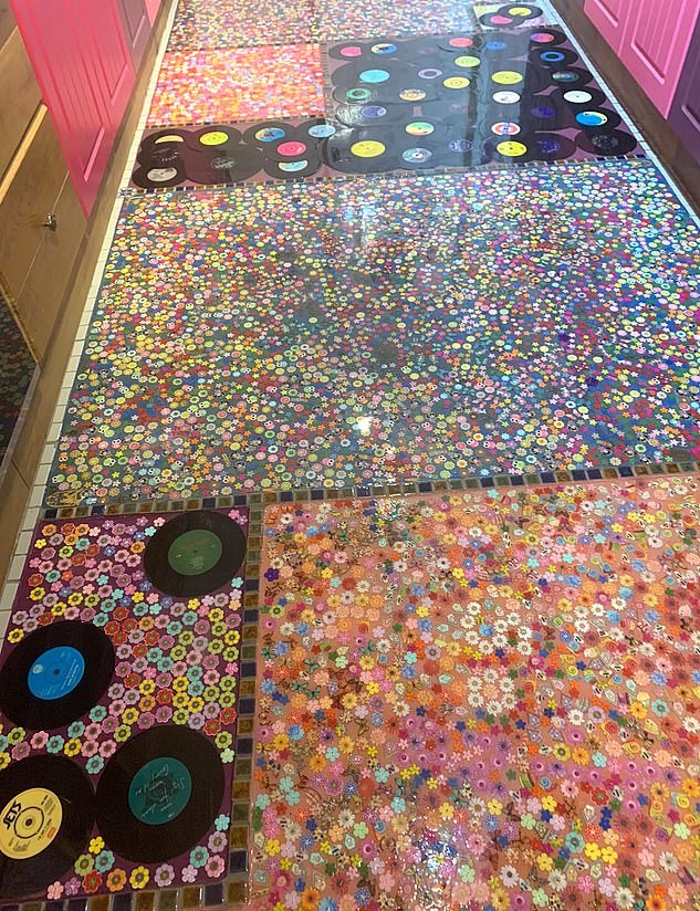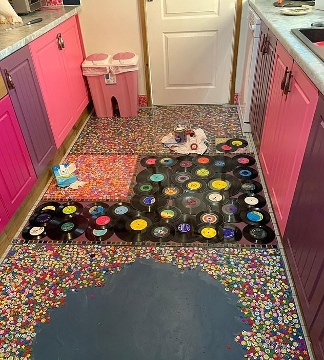 Besides using vinyl records for her expensive kitchen renovation project, the woman also collected some 5,000 flower buttons that are spread over other areas of the floor.