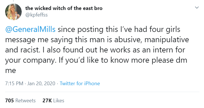 “@GeneralMills since posting this I’ve had four girls message me saying this man is abusive, manipulative and racist. I also found out he works as an intern for your company. If you’d like to know more please DM me,” she wrote on Twitter as she got the company that employed the guy involved.