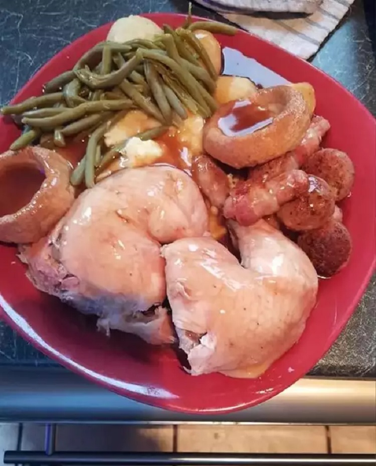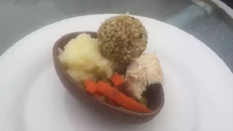 The woman named “Shazza D” shared a clip of herself on Rate My Plate that saw her pouring thick gravy onto what seemed like chicken, potato, carrots, and stuffing, all of them snug inside an Easter egg.