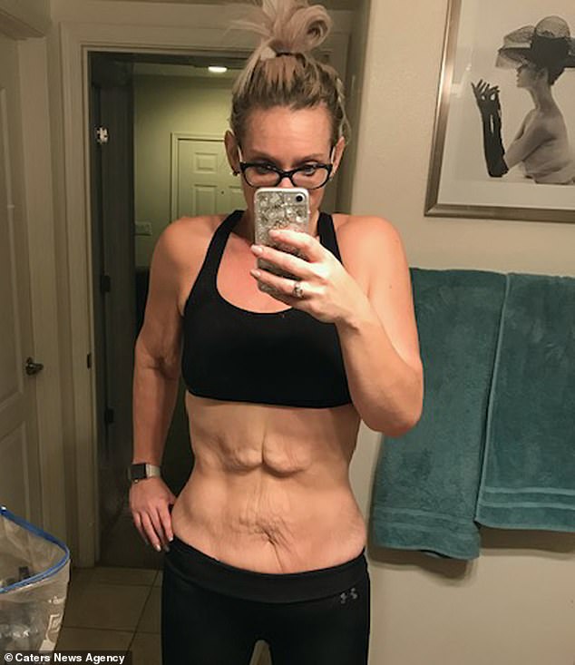 ‘It looks like a body pieced together with lots of parts but hidden beneath is something strong, powerful and muscular. If I turn to the side, I can see this outline of a beautiful female body hidden underneath all the stretch marks and scars from where my skin expanded and the weight loss.’
