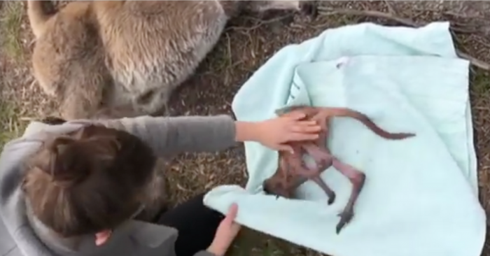 Ms. Wagner took the responsibility to help the baby. She brought a blue baby blanket and flattened it beside the dead kangaroo. She grabbed the baby’s feet, pulled it out, and covered it in the blanket.