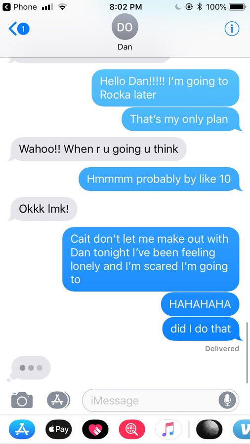 The text read: “Cait don’t let me make out with Dan tonight I’ve been feeling lonely and I’m scared I’m going to.”