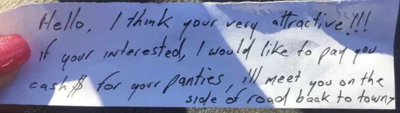 “Hello, I think your very attractive!!! If your interested, I would like to pay you cash $ for your panties. I’ll meet you on the side of road back to town. Just pull over I’ll find you,” the offer read.