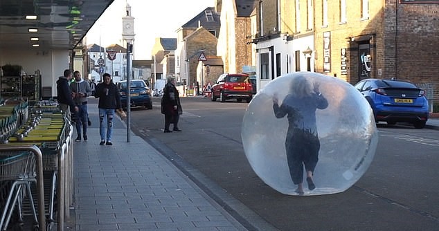 A woman has gone viral after she went shopping armed with a zorb ball in what appears to be a bizarre coronavirus-inspired prank.