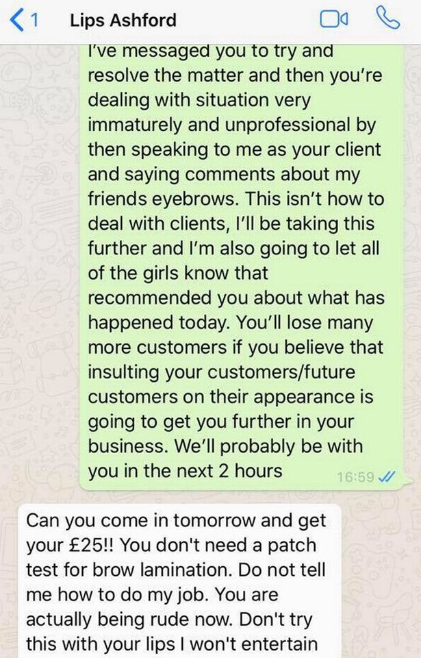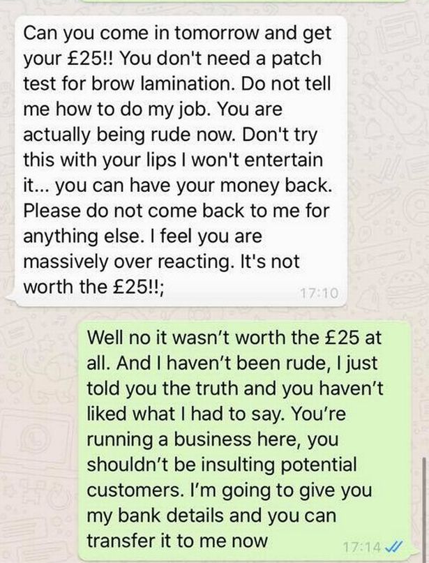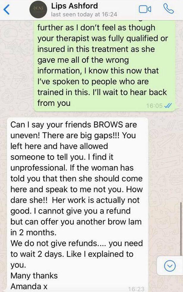Amanda also said she had offered to thin her eyebrows after the treatment and even offered a refund of £25 but said Melissa did not turn up at the salon.
