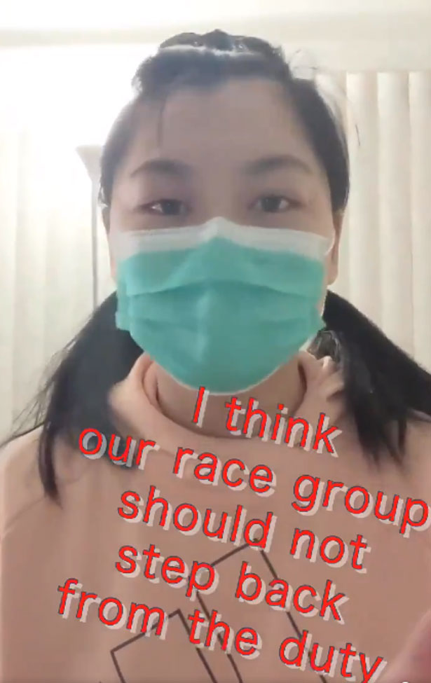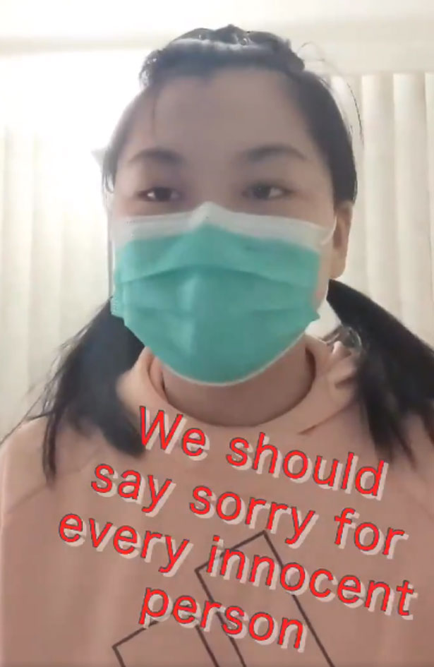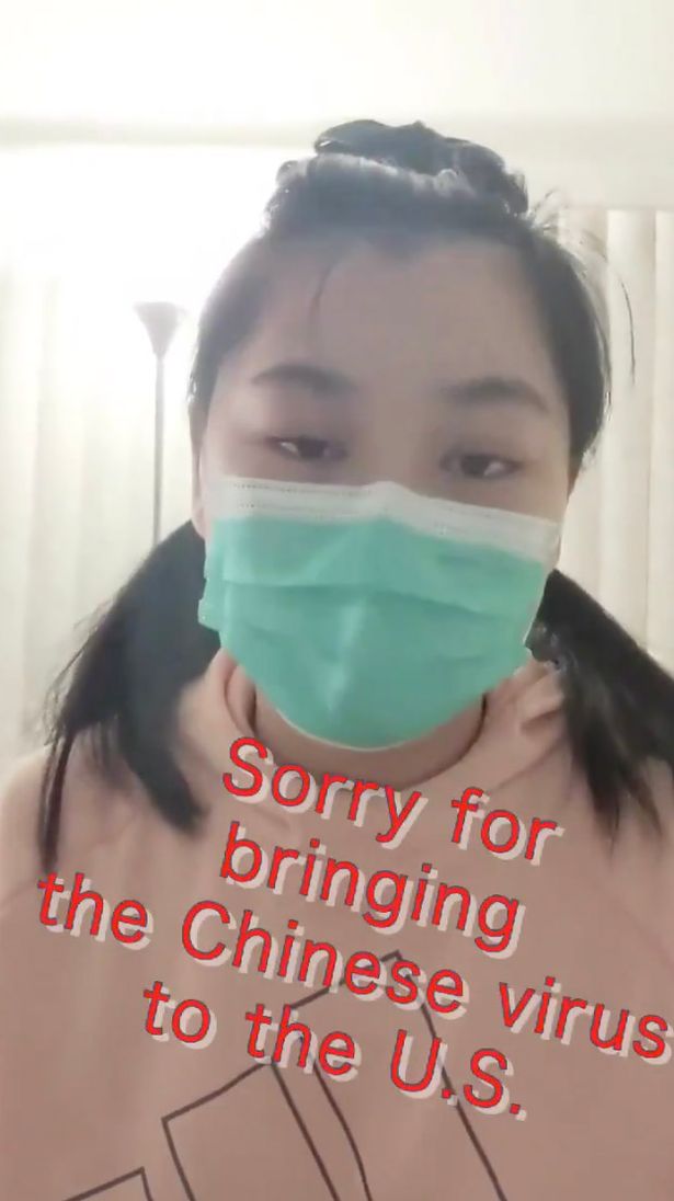 The woman says in the video that she is Chinese and she is sorry for bringing the Chinese virus to the US.