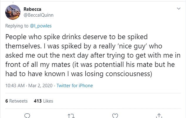 Someone else said: “People who spike drinks deserve to be spiked themselves. I was spiked by a really ‘nice guy’ who asked me out the next day after trying to get with me in front of all my mates (it was potential his mate but he had to have known I was losing consciousness).”