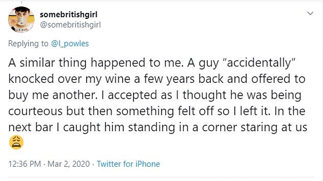 “The same lad robbed my drink twice last night, and put something in my glass when he bought me one back,” she wrote on Twitter.