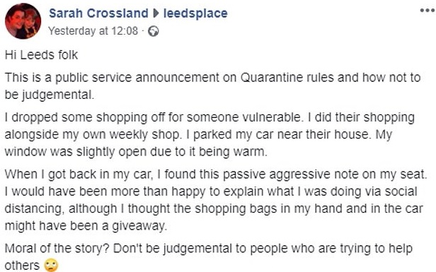 As Sarah Crossland from the UK explained in her Facebook post, she did some shopping to deliver groceries to a vulnerable person in Morley, Leeds, so that they wouldn’t have to break self-isolation.