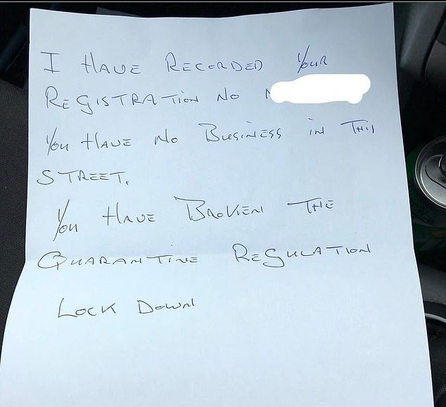 “When I got back in my car, I found this passive aggressive note on my seat. I would have been more than happy to explain what I was doing via social distancing, although I thought the shopping bags in my hand and in the car might have been a giveaway.”