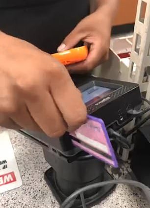 In the bizarre video, the unidentified woman appears dumbfounded as she is told by the shop manager that she couldn’t pay for her stuff using toy credit cards.