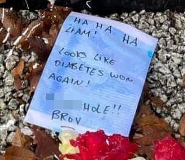 “Ha ha ha Liam. Looks like diabetes won again. P***yhole bruv,” she wrote on the note.