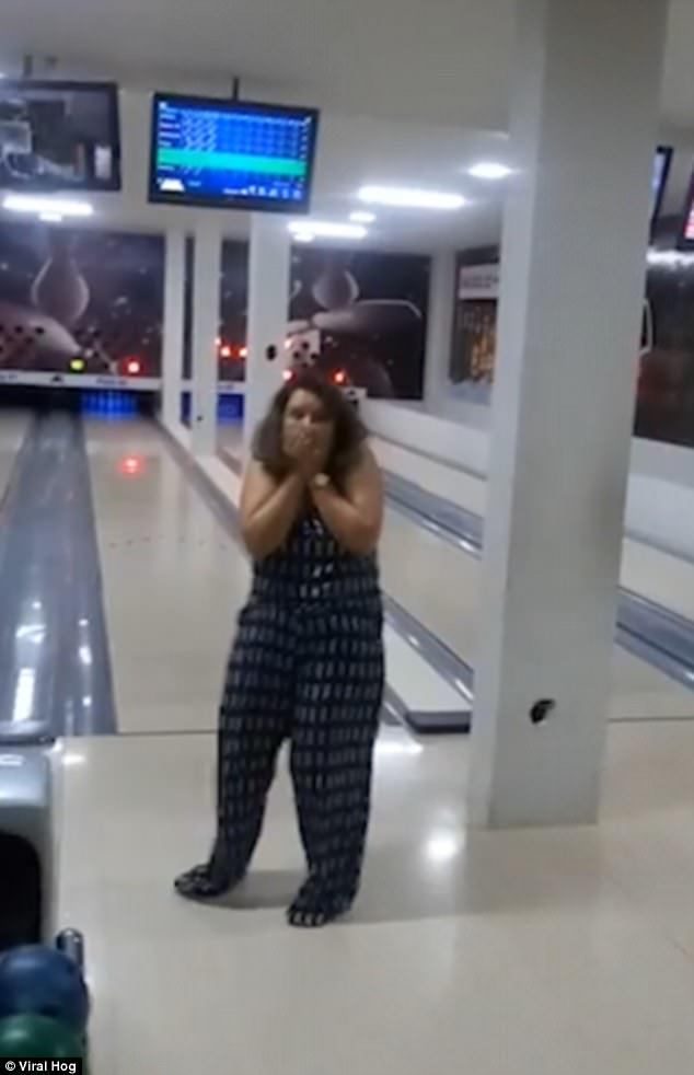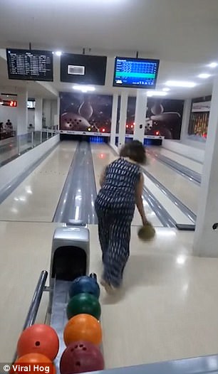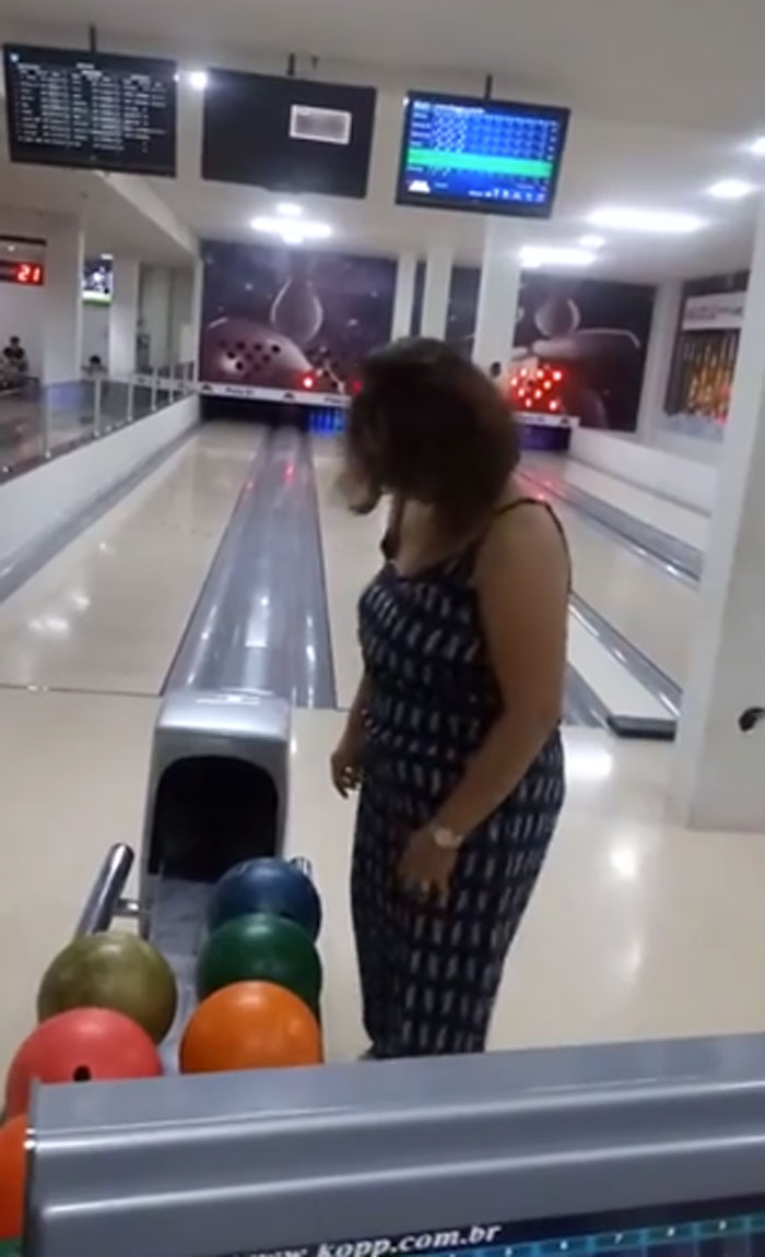 The hilarious video clip shows the woman named Dorinha attempting bowling at an alley in Cacoal in Rondonia, Brazil.