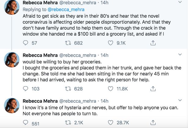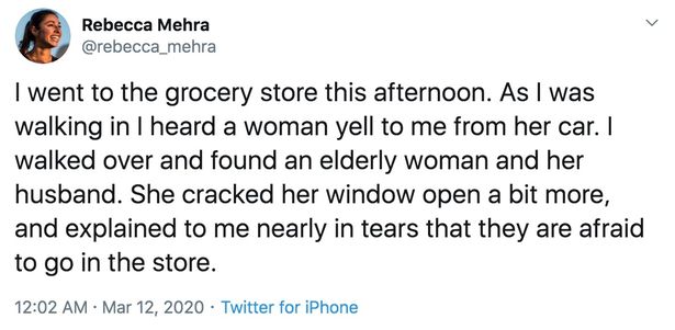 The post instantly went viral online and people praised Rebecca for helping the elderly couple instead of making a distance from them as everyone is doing these days amid coronavirus fears.