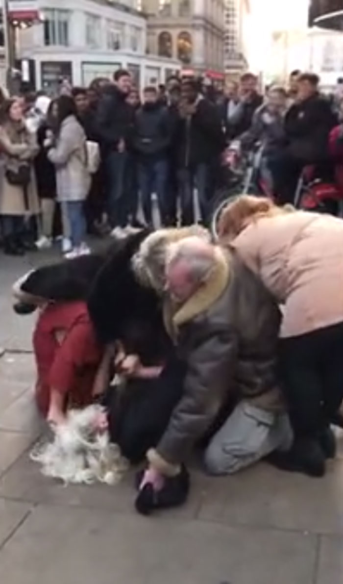 A man tried to intervene and the woman in the red coat shouted: ‘Move out of the way.’