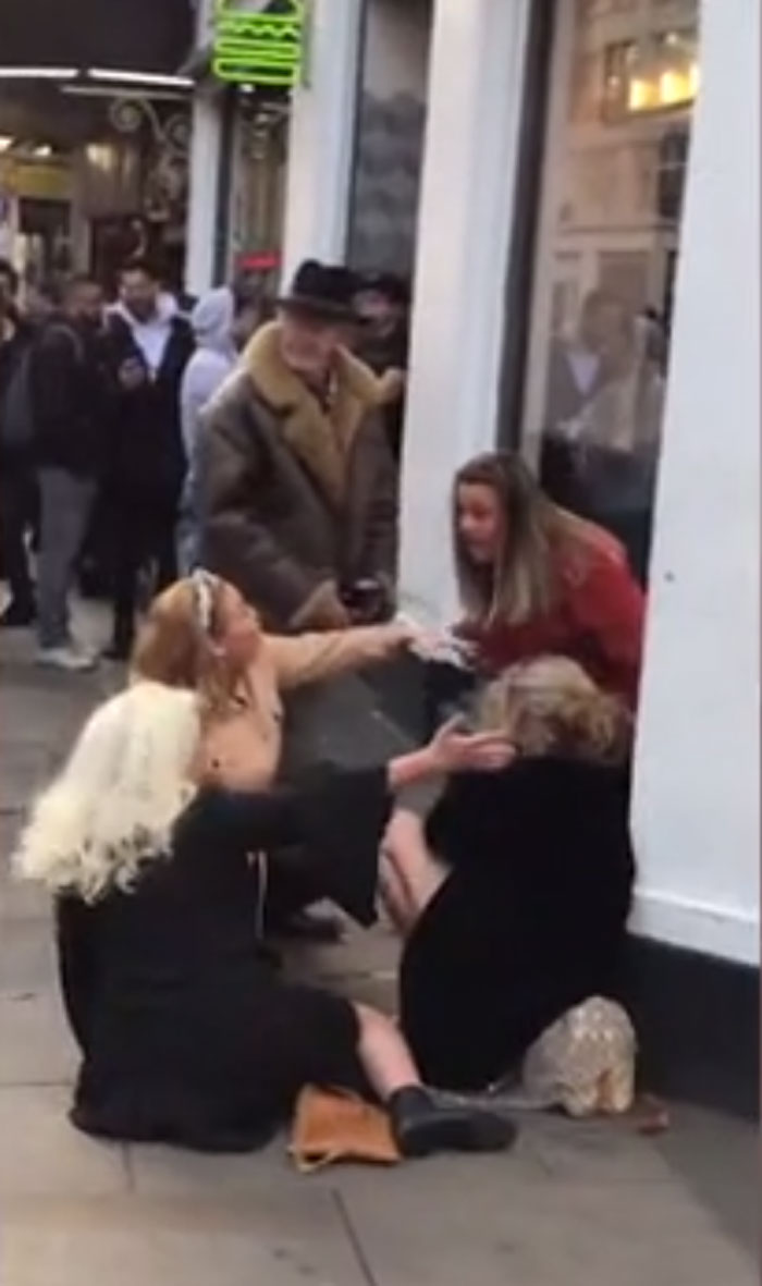 The man, who had tried to intervene, tried to stop the fight and grabbed the blonde woman’s waist before the three women fell to the ground.