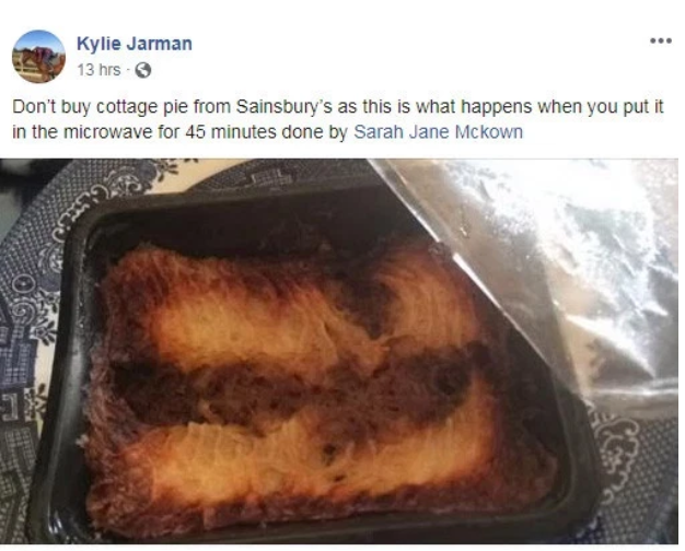 She is not aware of her mistake and has posted the picture of the burnt Cottage pie on the Facebook and left a note that no one should buy the cottage pie from Sainsbury and shown the picture that if you buy and microwave it for 45 minutes. She also stated that the cottage pie was inedible after moving it out of the microwave.
